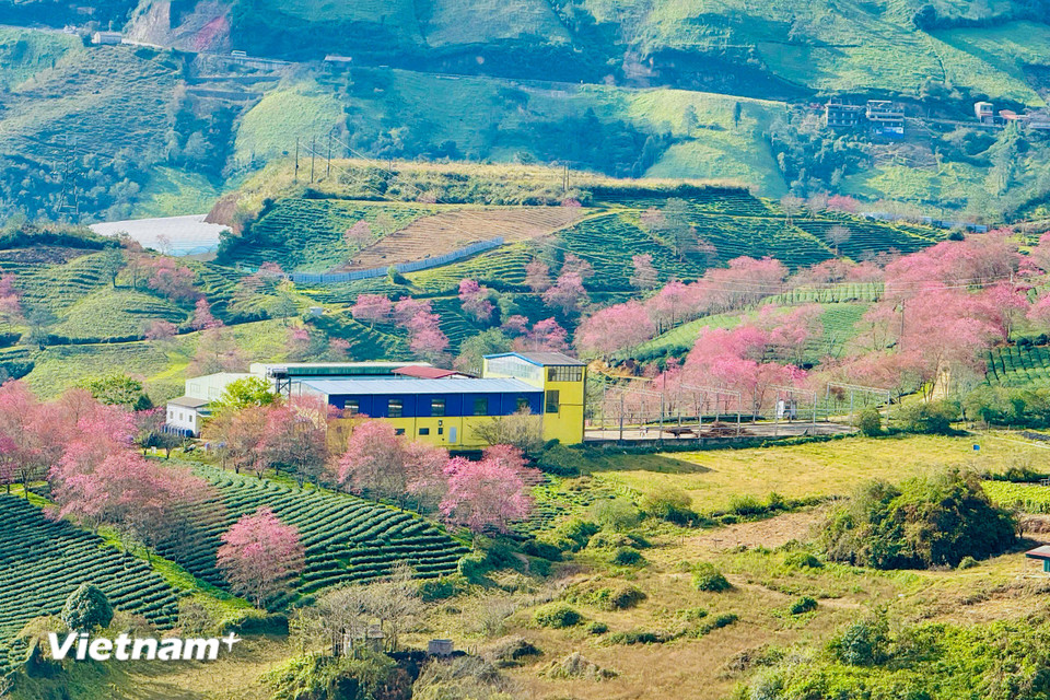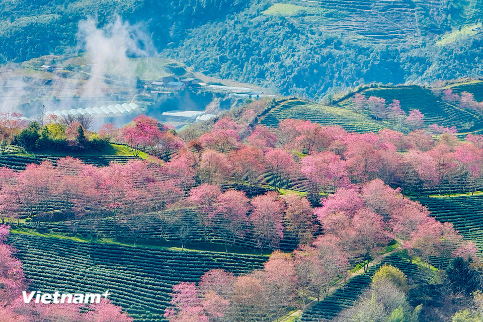 Những triền đồi phủ kín sắc hồng rực mai anh đào. (Ảnh: Trần Hương Sơn/Vietnam+)