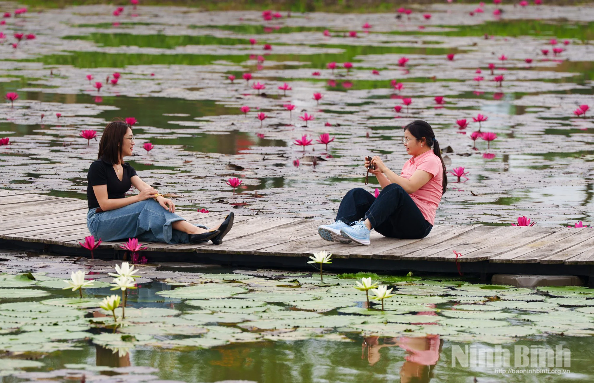 Du khách cùng nhau ghi lại những khoảnh khắc của mùa hoa súng tại Tam Chúc.