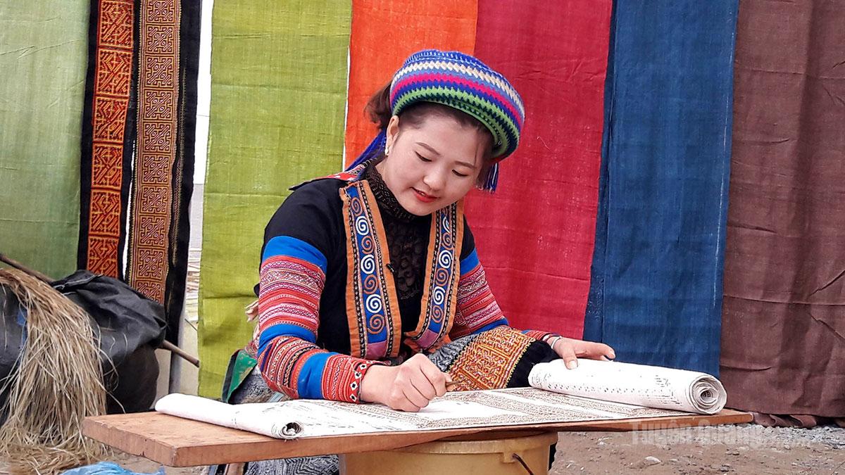 hiếu nữ dân tộc Mông xã Lùng Tám tỉ mỉ vẽ sáp ong trên vải thổ cẩm.