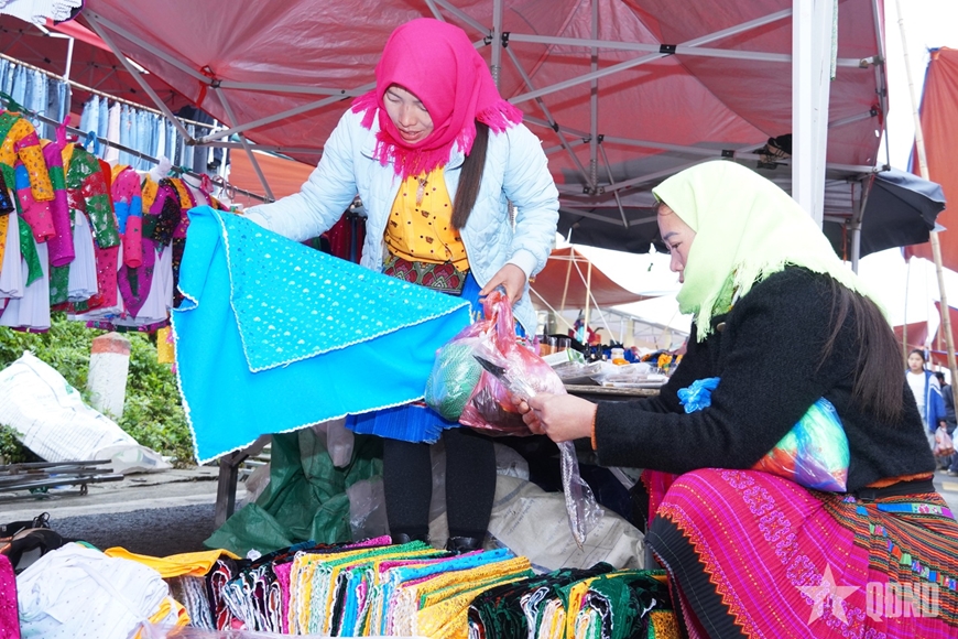 Đồng bào lựa chọn vải vóc, khăn truyền thống tại chợ phiên.