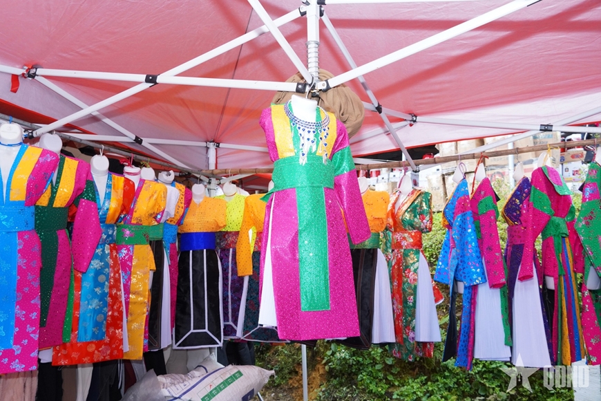 Những bộ trang phục truyền thống sặc sỡ sắc màu của đồng bào Mông được bày bán tại chợ phiên Xín Cái.