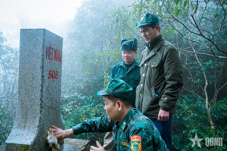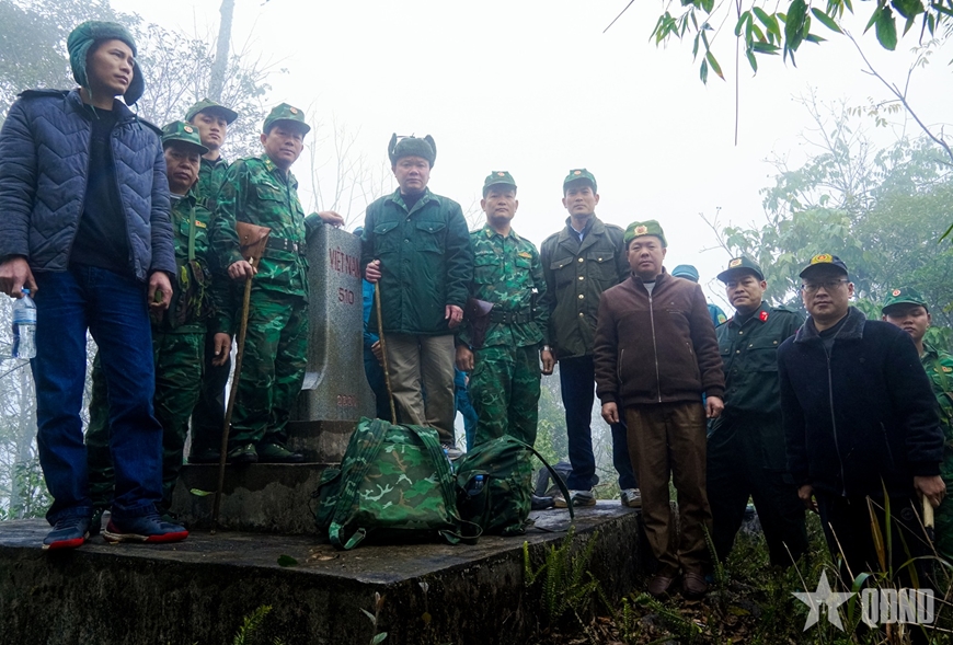 Cán bộ, chiến sĩ Đồn Biên phòng Sơn Vĩ kiểm tra, vệ sinh cột mốc 508 trong quá trình tuần tra biên giới.