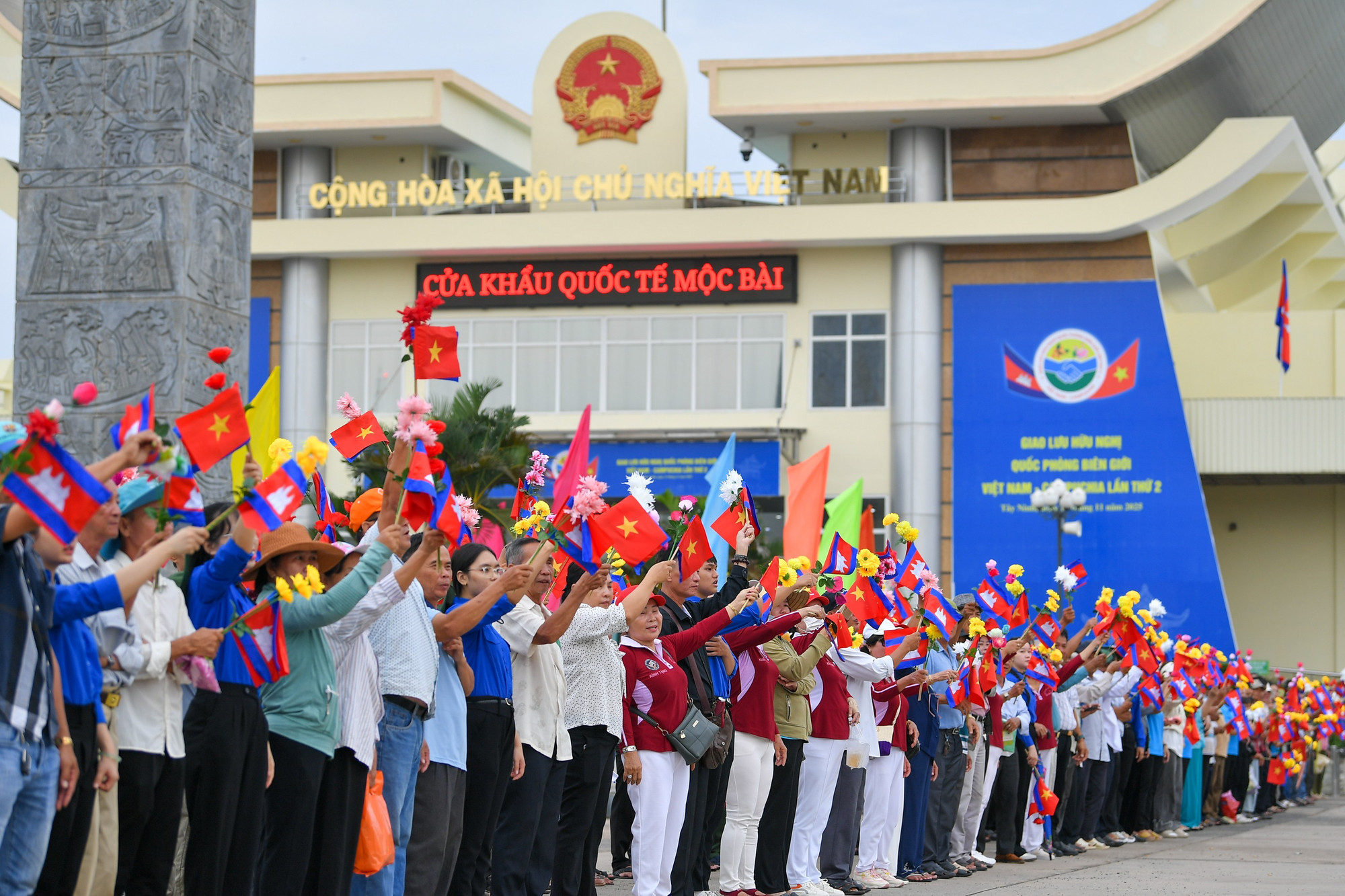 Người dân tại Cửa khẩu Quốc tế Mộc Bài với cờ hoa chào mừng.