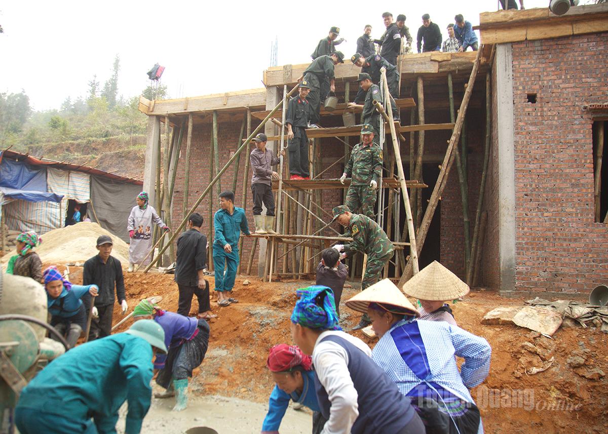 Lực lượng vũ trang đóng trên địa bàn xã Xín Mần hỗ trợ người dân xóa nhà tạm ở thôn Lùng Cháng.