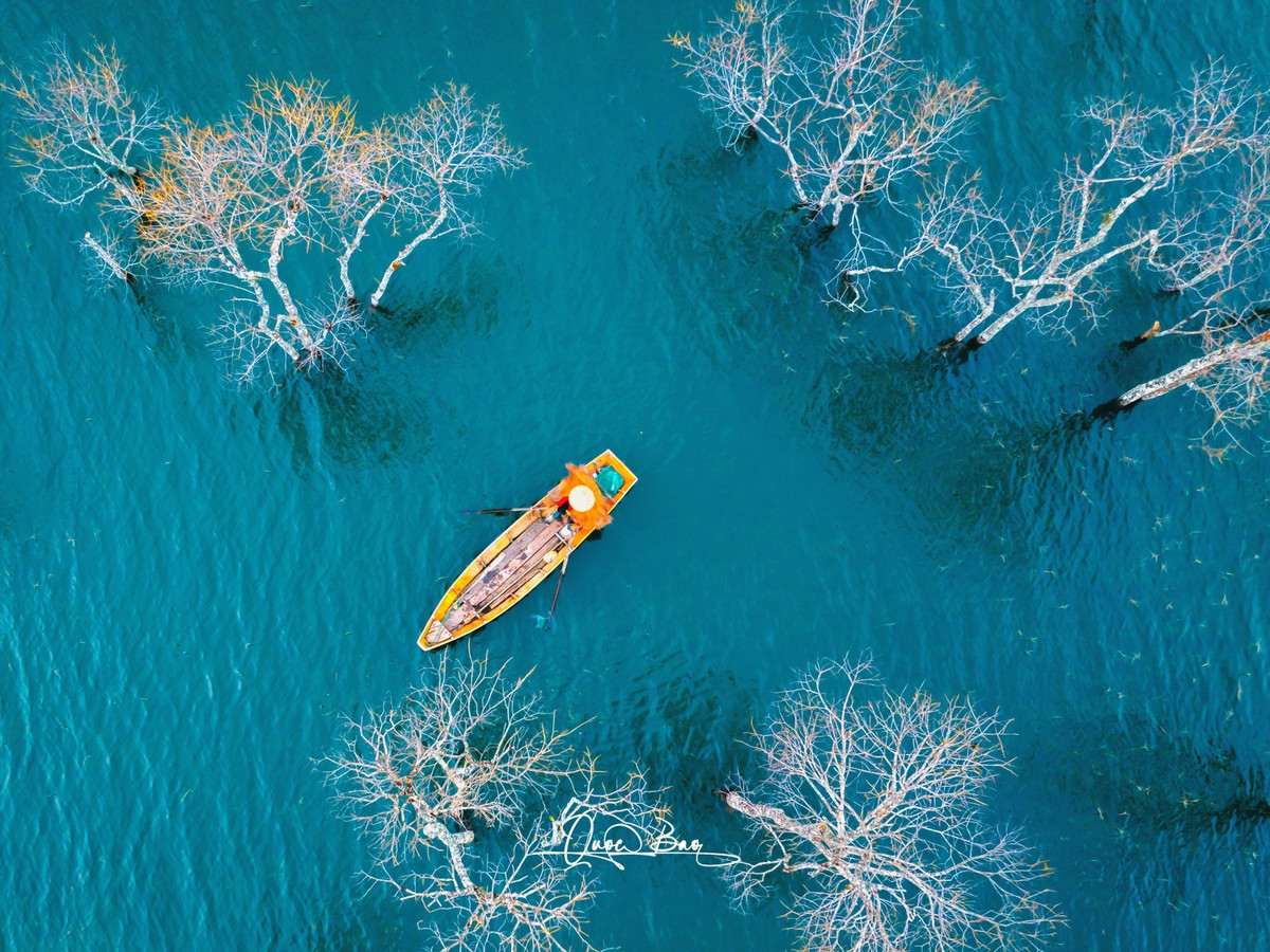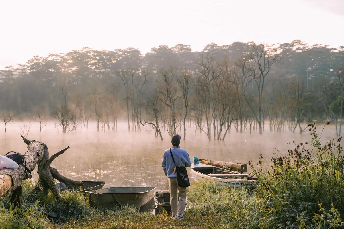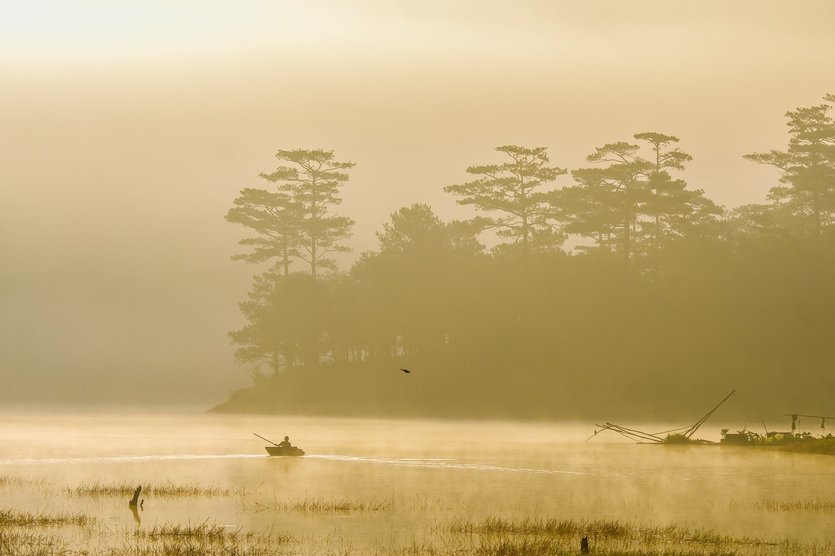 xuống mặt nước tĩnh lặng, những ngư phủ trầm ngâm cùng chiếc thuyền nhỏ, tạo nên khung cảnh tựa phim kiếm hiệp.