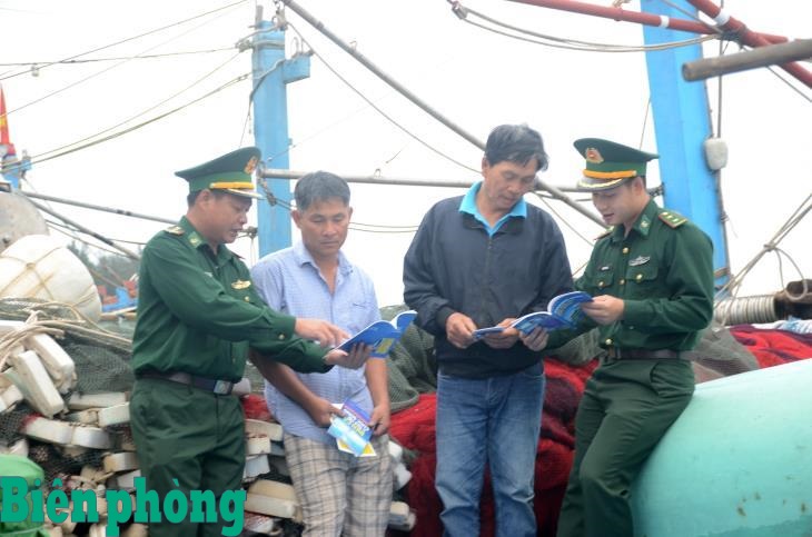 Cán bộ Đồn Biên phòng Vinh Hiền, BĐBP thành phố Huế tuyên truyền cho ngư dân về phòng, chống khai thác IUU.