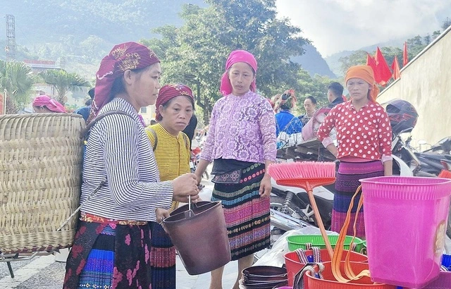 Dọc theo những con đường vắt vẻo ngang lưng chừng núi, đâu đâu cũng thấy hình ảnh các bà, các mẹ tất bật bên khung cửi, thêu nốt những đường kim cuối cùng trên vạt áo mới. Những bộ váy xòe xếp nếp lộng lẫy, đủ sắc màu được đem ra phơi nắng, trông xa như những đóa hoa rừng rực rỡ bừng nở giữa màn sương mù đặc quánh.