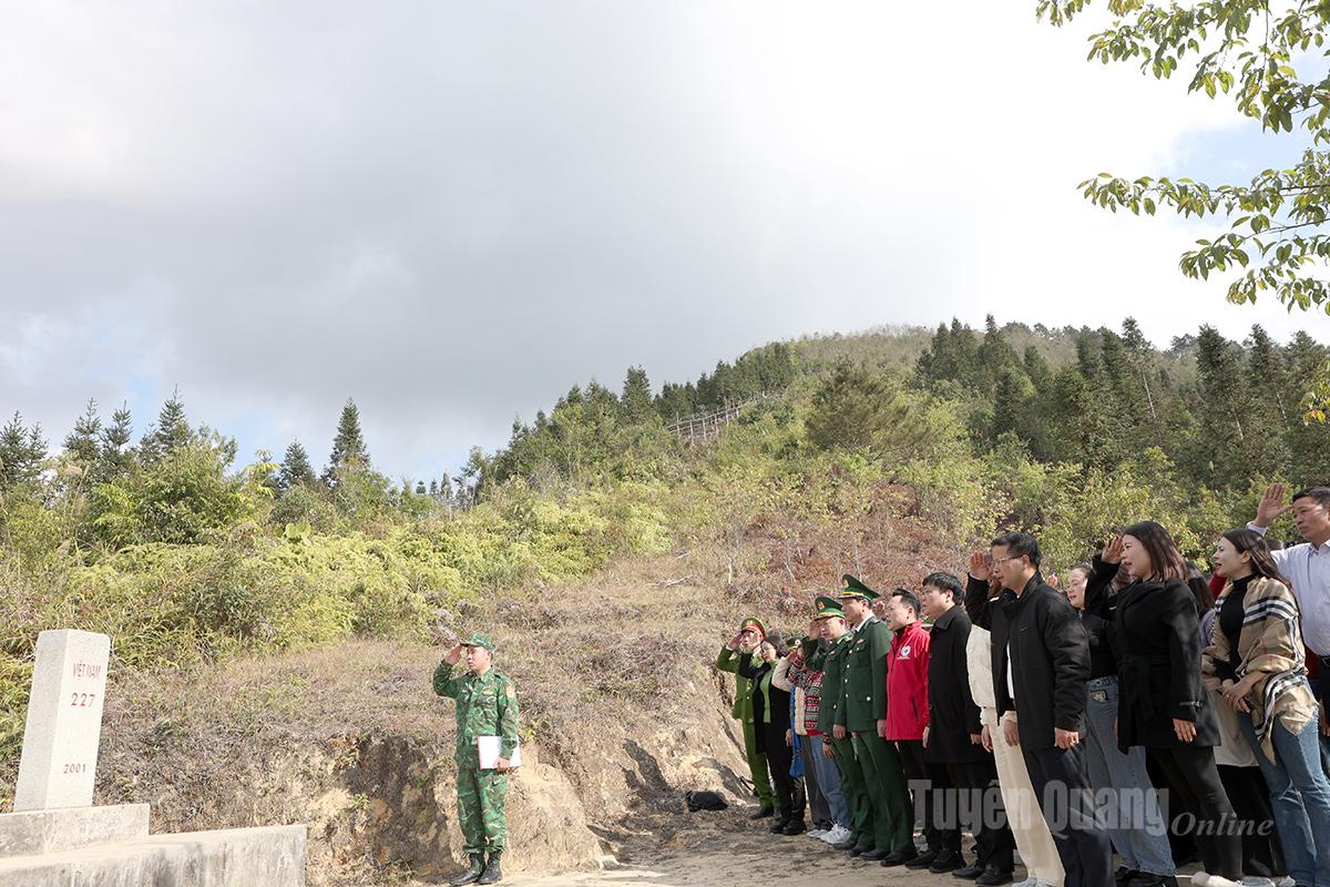 Tại cột mốc 227, các đại biểu đã thực hiện nghi lễ Chào cờ, hát Quốc ca trang nghiêm. Trong không khí thiêng liêng nơi biên cương Tổ quốc, đại diện Đồn Biên phòng Thàng Tín đã giới thiệu về đường biên, mốc giới và công tác bảo vệ chủ quyền lãnh thổ quốc gia tại khu vực.