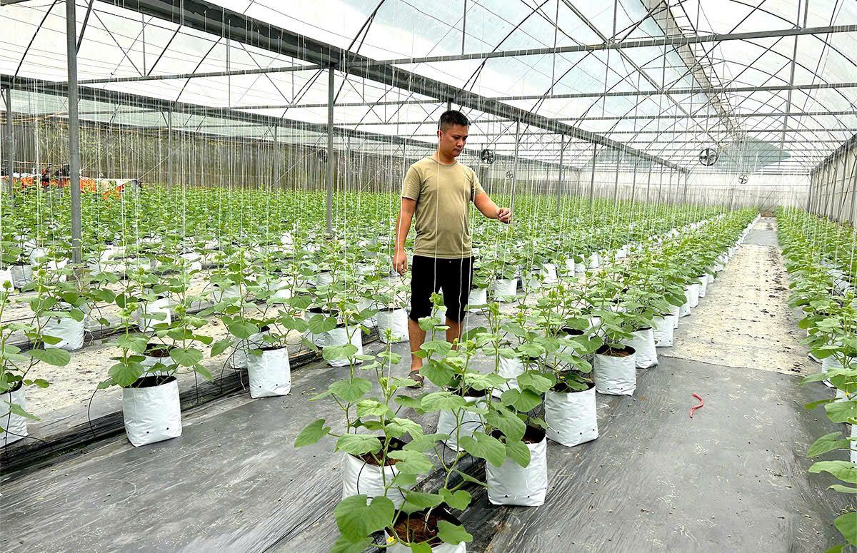 Anh Nguyễn Việt Lâm, thôn Gốc Quéo, xã Tân Thanh kiểm tra giàn dây leo của khu nhà màng trồng dưa lưới.
