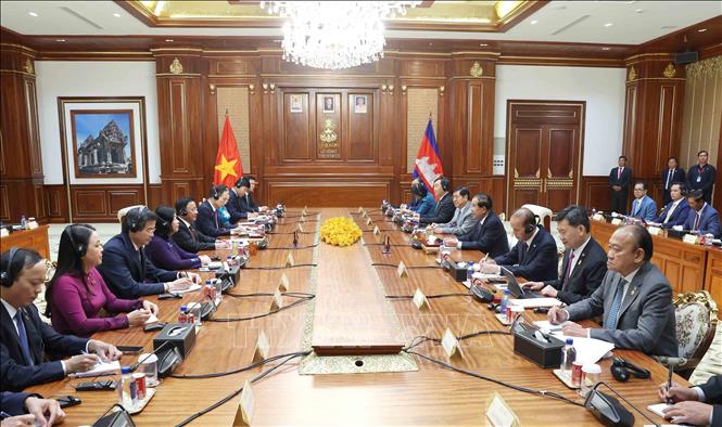Thường trực Ban Bí thư Trần Cẩm Tú trao đổi cùng Chủ tịch CPP, Chủ tịch Thượng viện Campuchia Hun Sen.