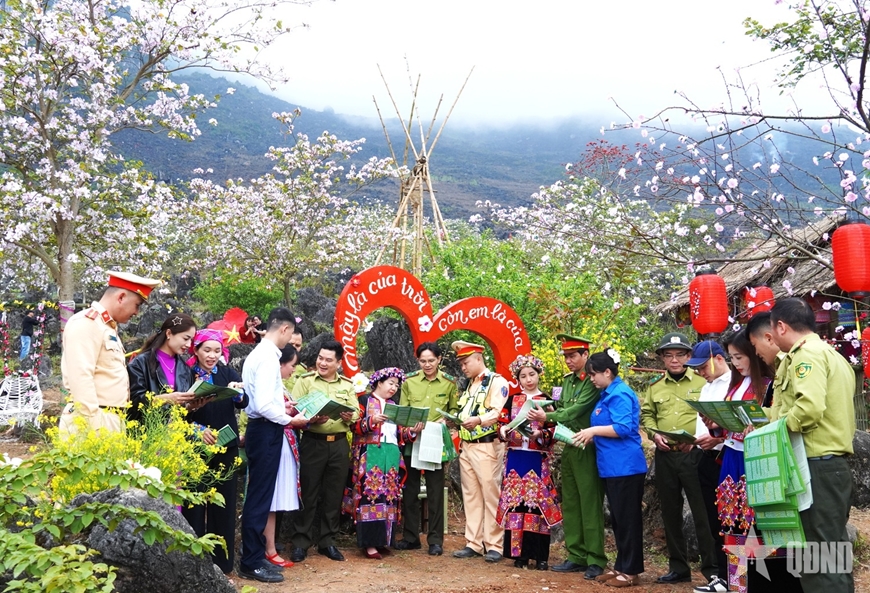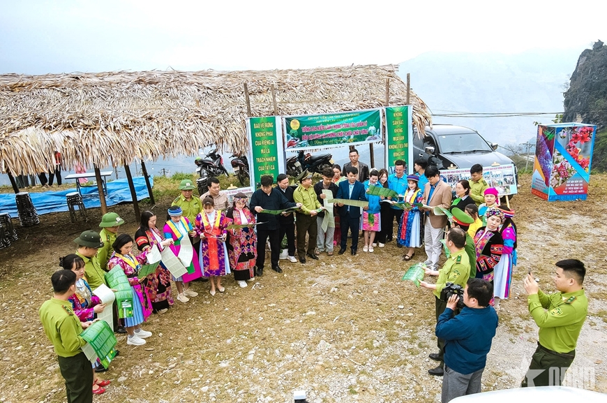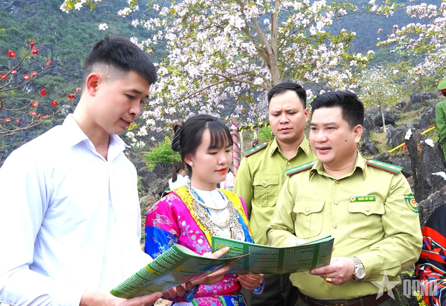 Giữa không gian núi đá tai mèo hùng vĩ, những tấm pano, áp phích trực quan về bảo vệ rừng, phòng cháy, chữa cháy rừng được dựng lên sinh động. Tài liệu tuyên truyền được cán bộ kiểm lâm tận tay phát cho người dân; các nội dung pháp luật, khuyến cáo được giải thích cụ thể, dễ hiểu ngay tại thực địa, dưới tán hoa ban đang nở rộ.