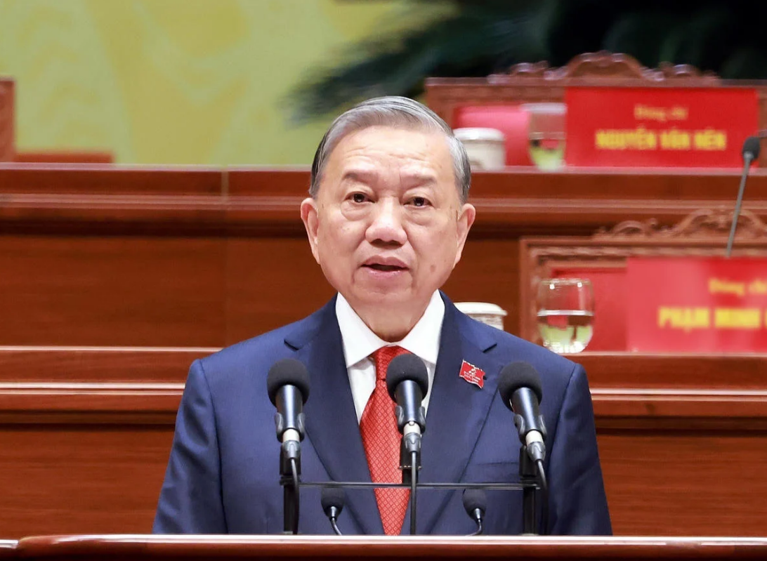 Tổng Bí thư Tô Lâm thay mặt Ban Chấp hành Trung ương Đảng khóa XIV phát biểu (Ảnh TTXVN)