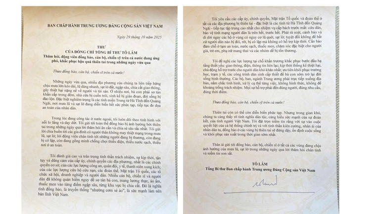 Tổng Bí thư Tô Lâm gửi Thư thăm hỏi, động viên đồng bào, cán bộ, chiến sĩ trên cả nước