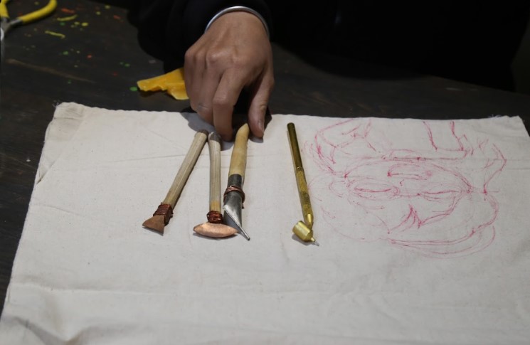 Người thợ hướng dẫn du khách vẽ những nét vẽ phác thảo đầu tiên trên vải