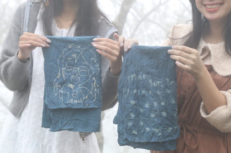 Thành phẩm tạo họa tiết và nhuộm chàm cho vải của du khách sau khi làm xong sẽ được phơi khô.