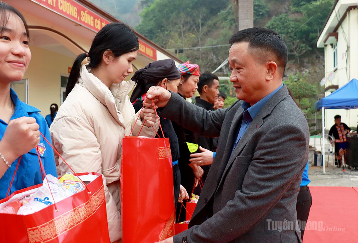 Lãnh đạo Báo và phát thanh, truyền hình Tuyên Quang tặng quà các hộ nghèo xã Thanh Thủy.