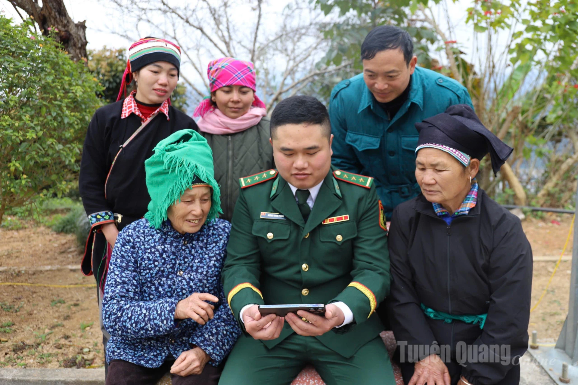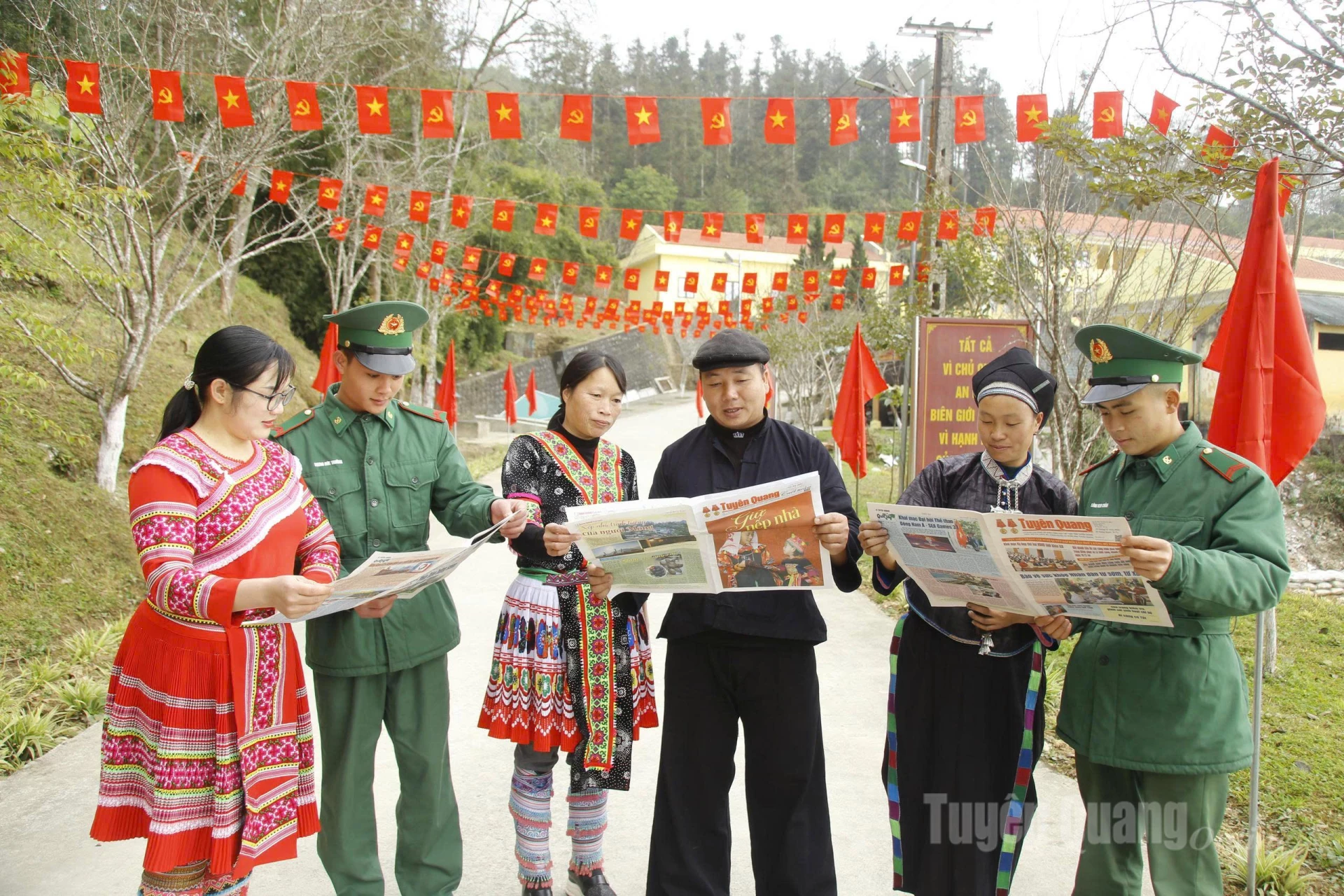 Nhân dân và lực lượng vũ trang ở xã Xín Mần cập nhật thông tin Đại hội trên Báo Tuyên Quang. Ảnh: Văn Long