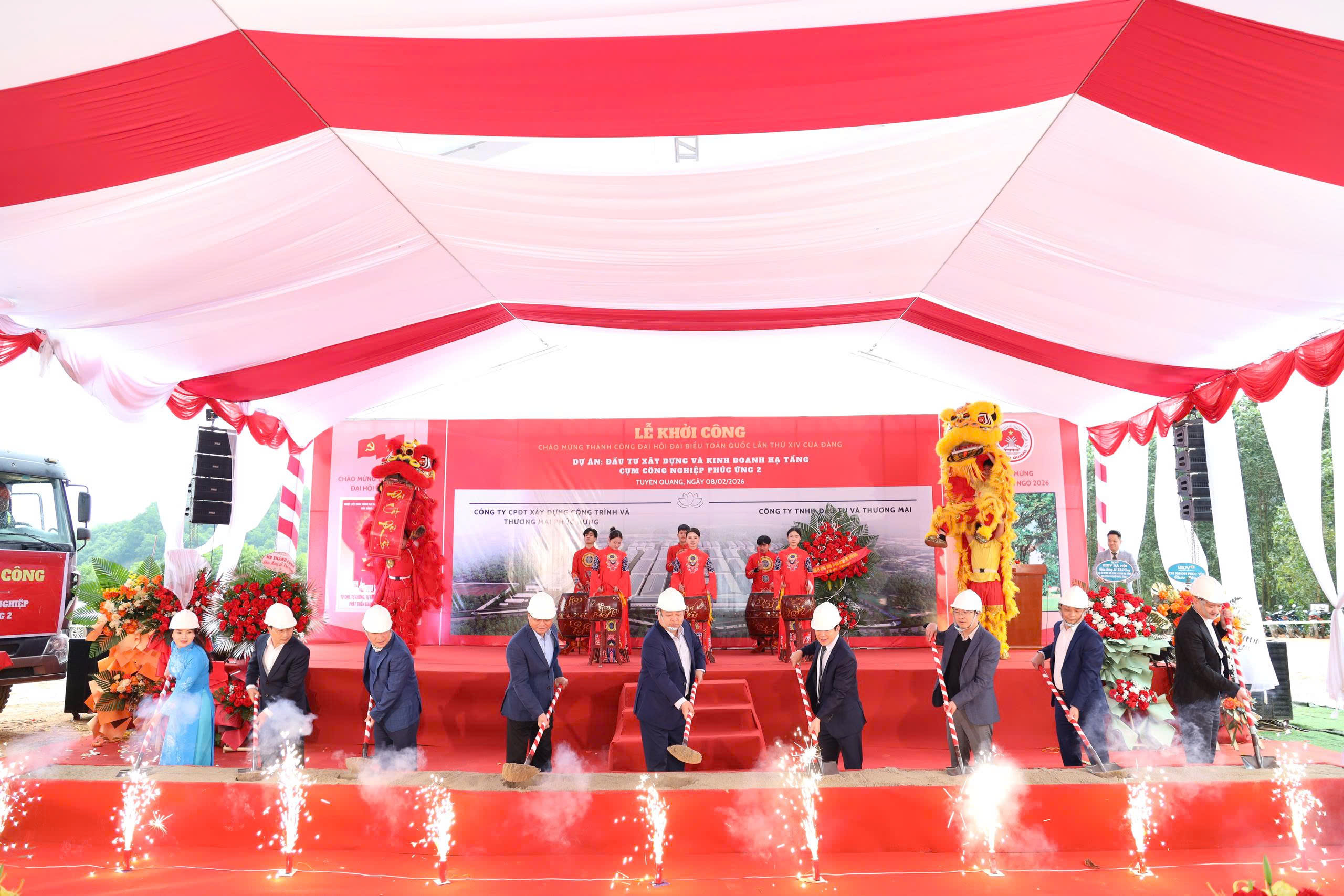 Các đại biểu thực hiện lễ khởi công dự án hạ tầng Cụm công nghiệp Phúc Ứng 2.