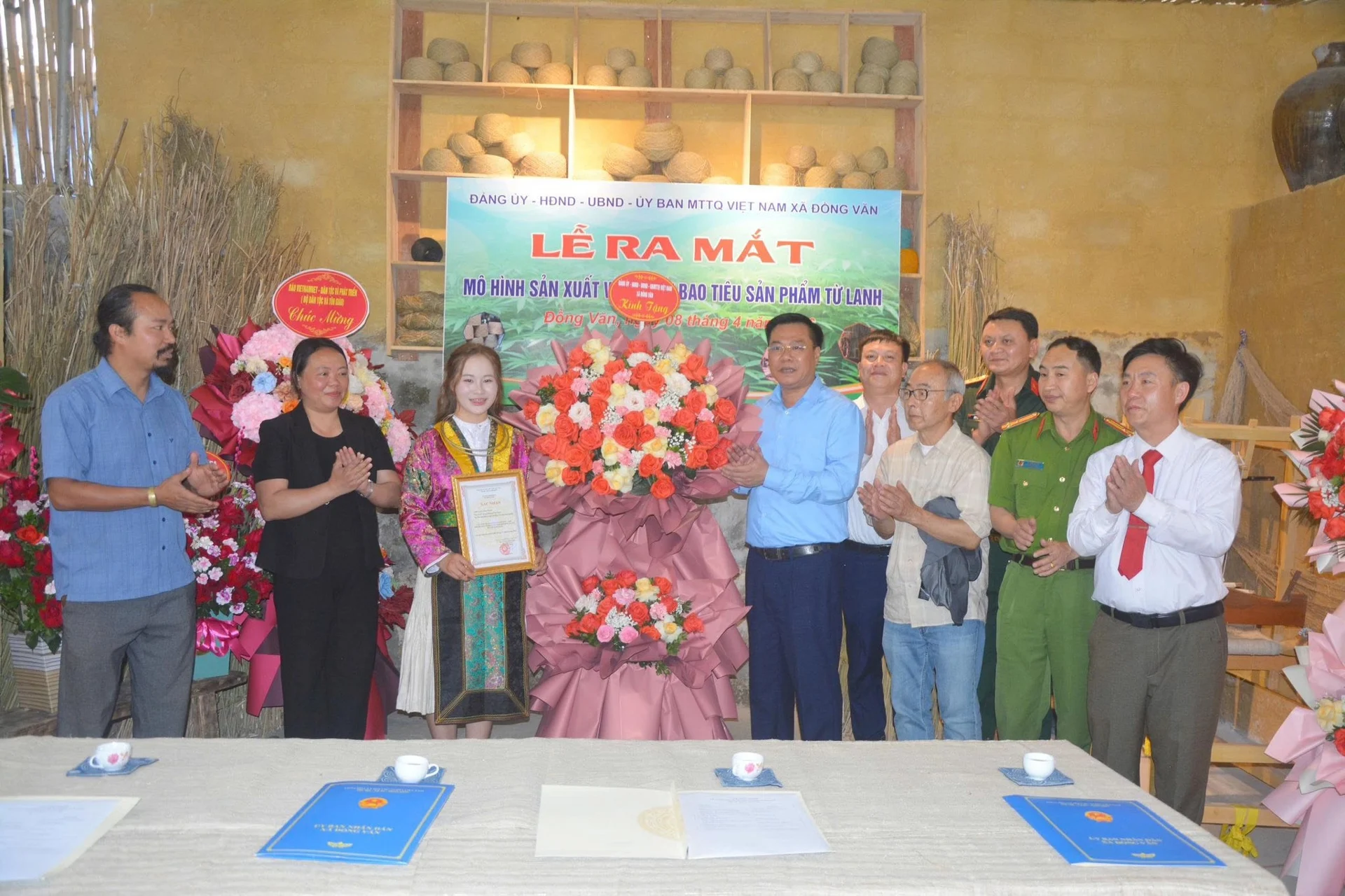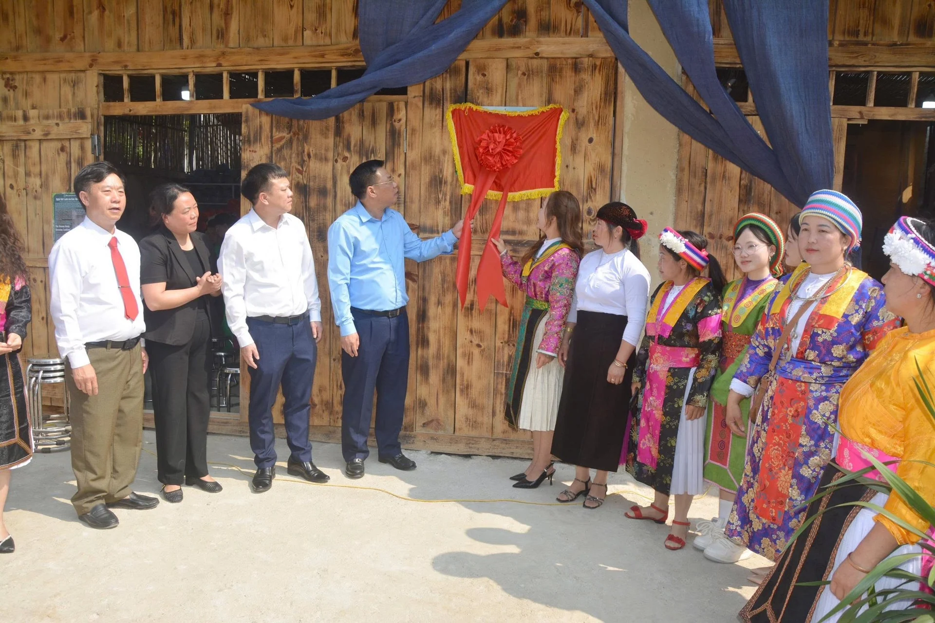 \Các đại biểu đã thực hiện gắn biển “Mô hình liên kết và tiêu thụ các sản phẩm từ lanh”. Ảnh: TT Đồng Văn.