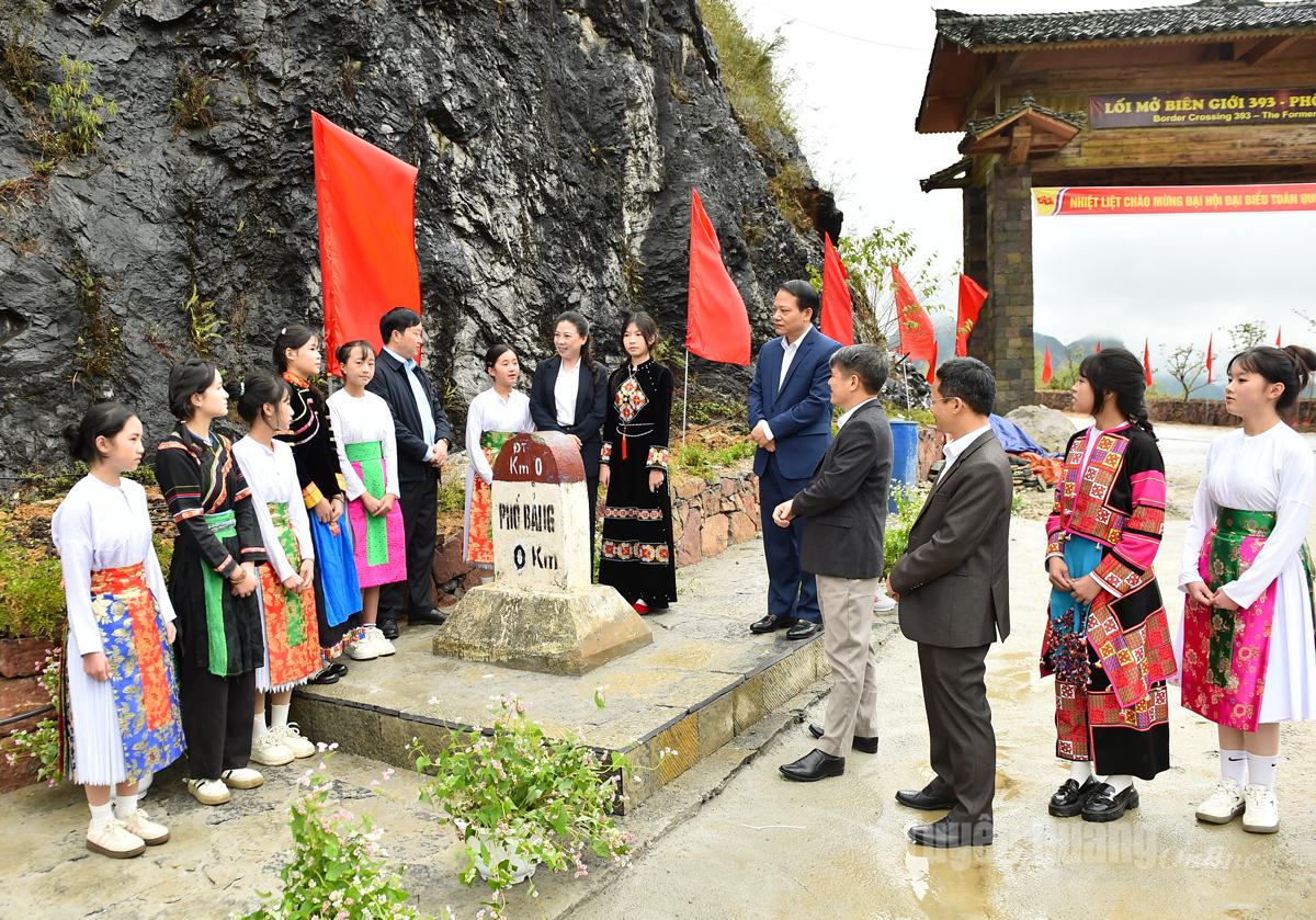 Cán bộ xã Phố Bảng và các em học sinh chào đón đồng chí Phó Bí thư Thường trực Tỉnh ủy Lê Thị Kim Dung