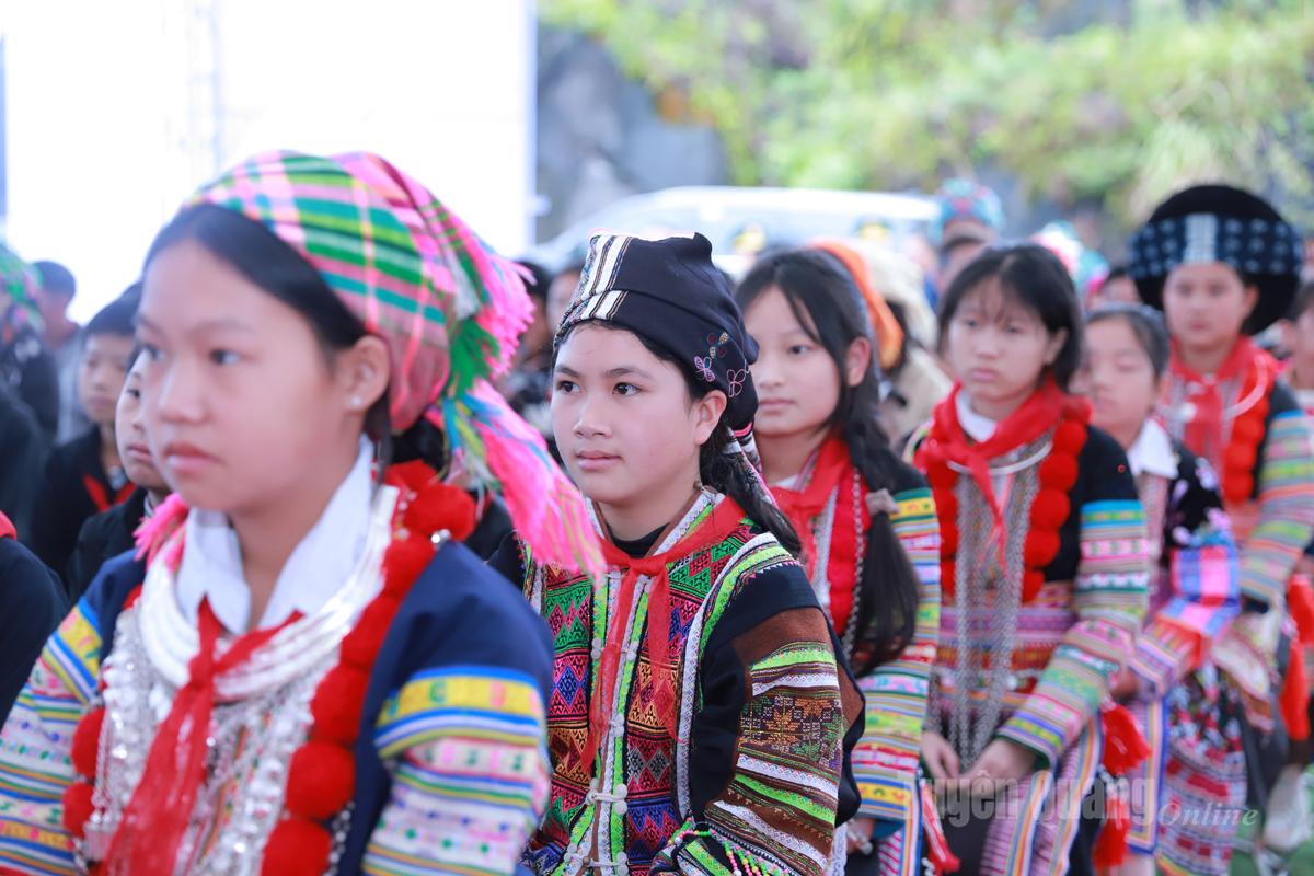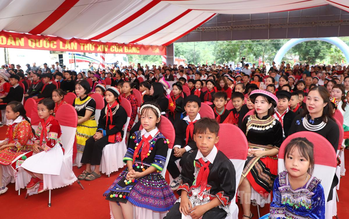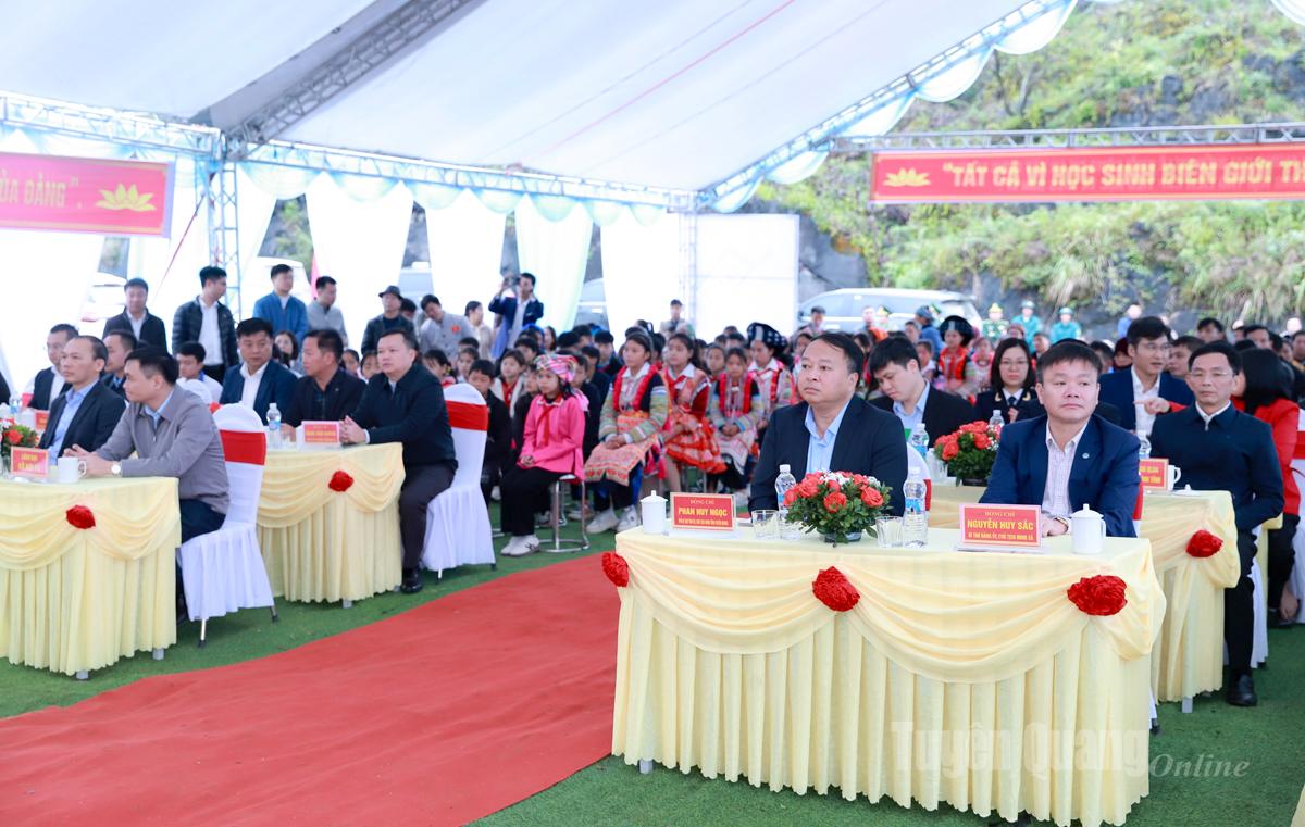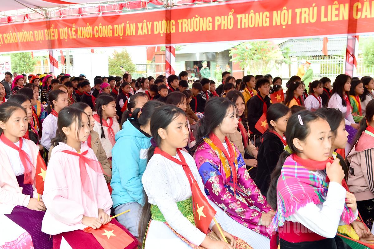 Các em học sinh Trường Phổ thông Dân tộc nội trú THCS xã Phố Bảng tham dự lễ khởi công. Ảnh: Thanh Phúc