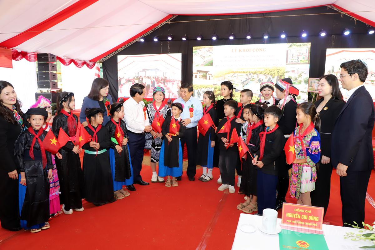 các đại biểu trò chuyện với học sinh xã Pà Vầy Sủ tại Lễ khởi công. Ảnh: Hồng Nhung