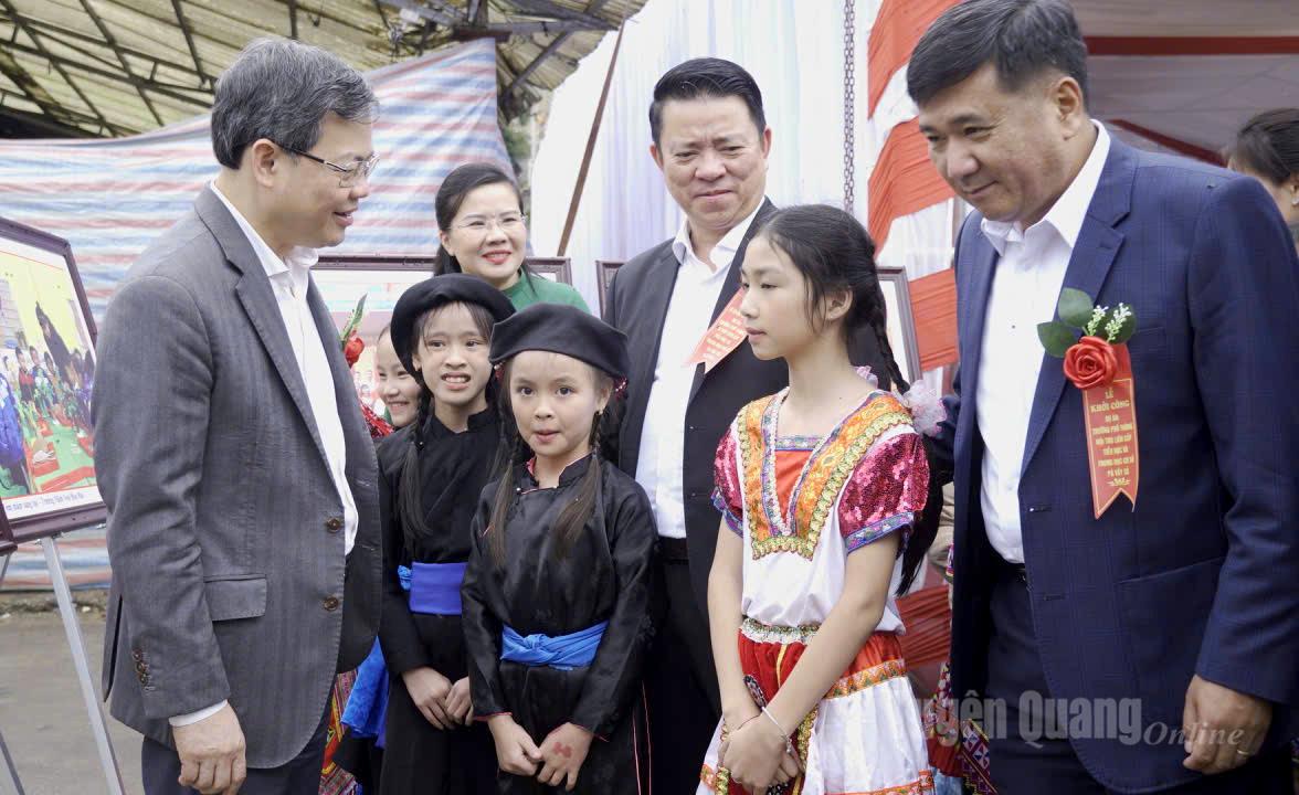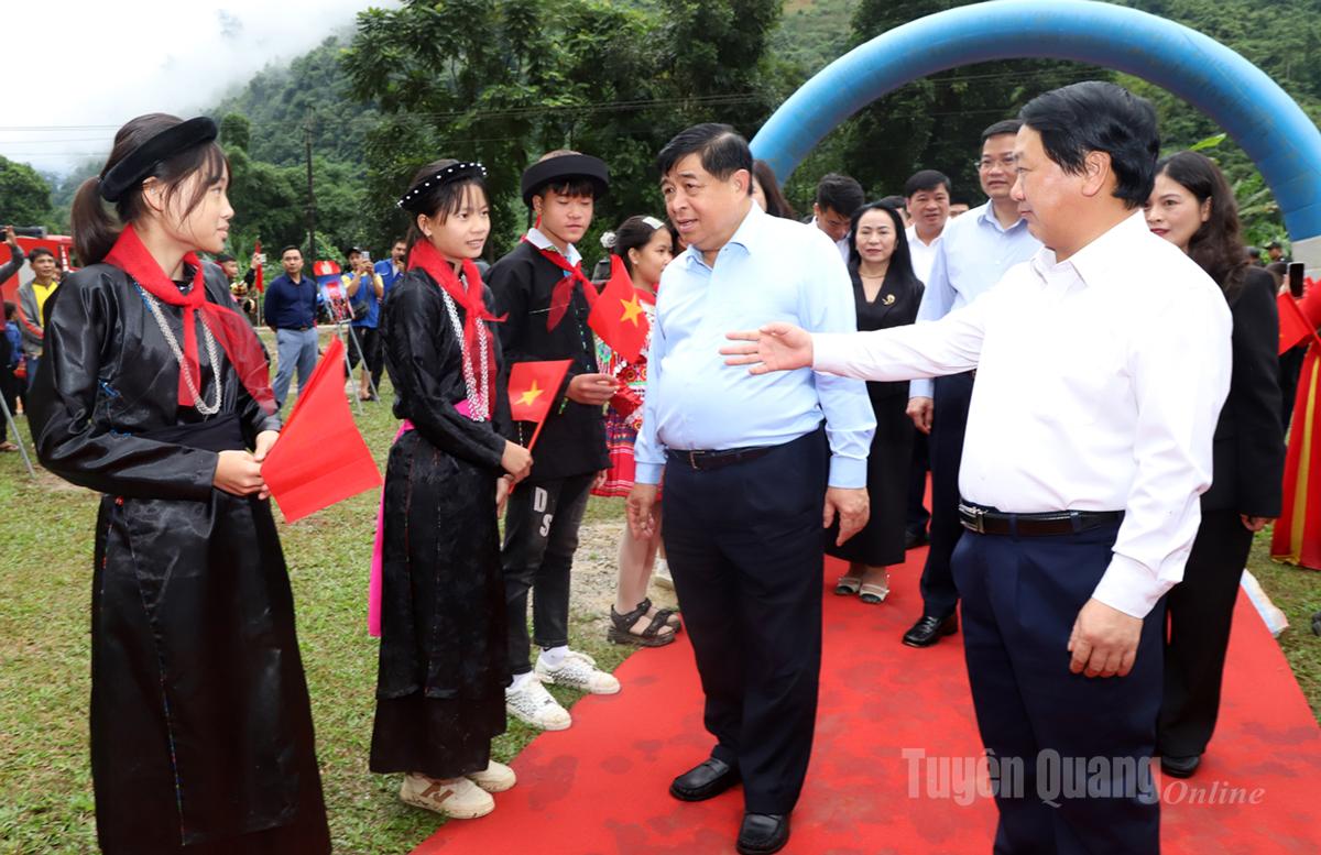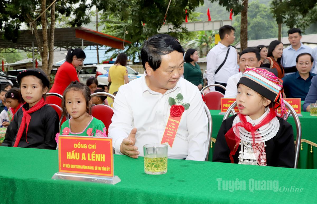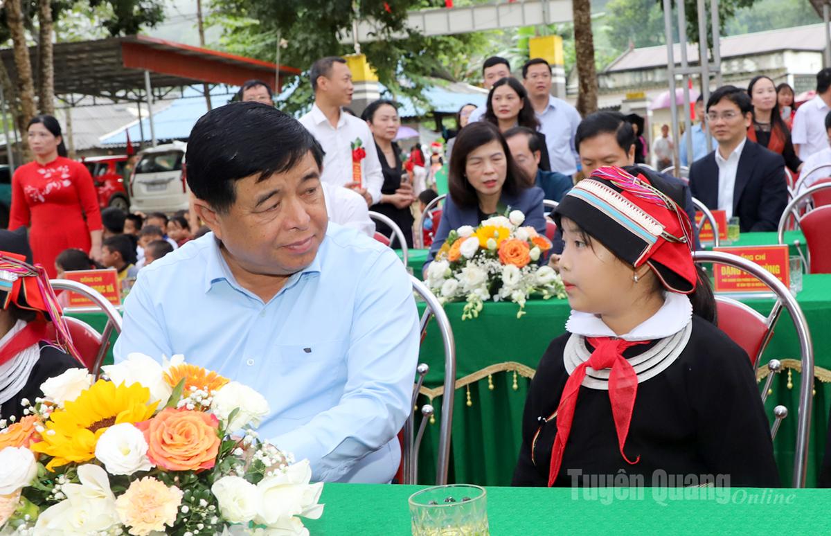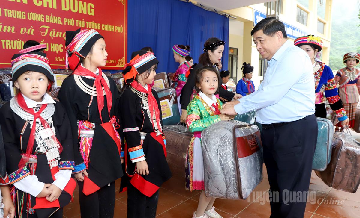 Phó Thủ tướng Chính phủ Nguyễn Chí Dũng và Bí thư Tỉnh ủy Hầu Anh Lềnh thăm hỏi các em học sinh xã Minh Tân.