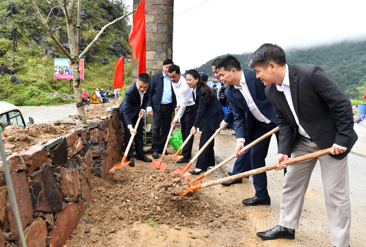 cùng các đại biểu trồng cây lưu niệm tại cổng chào xã Phố Bảng. Ảnh: Thanh Phúc