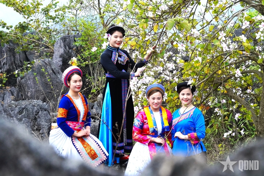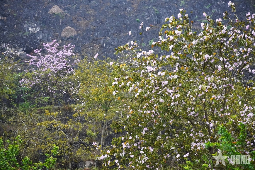 Cùng với sắc đỏ của hoa Mộc miên, hoa Ban đang nở rộ, phủ trắng tím các triền núi đá.