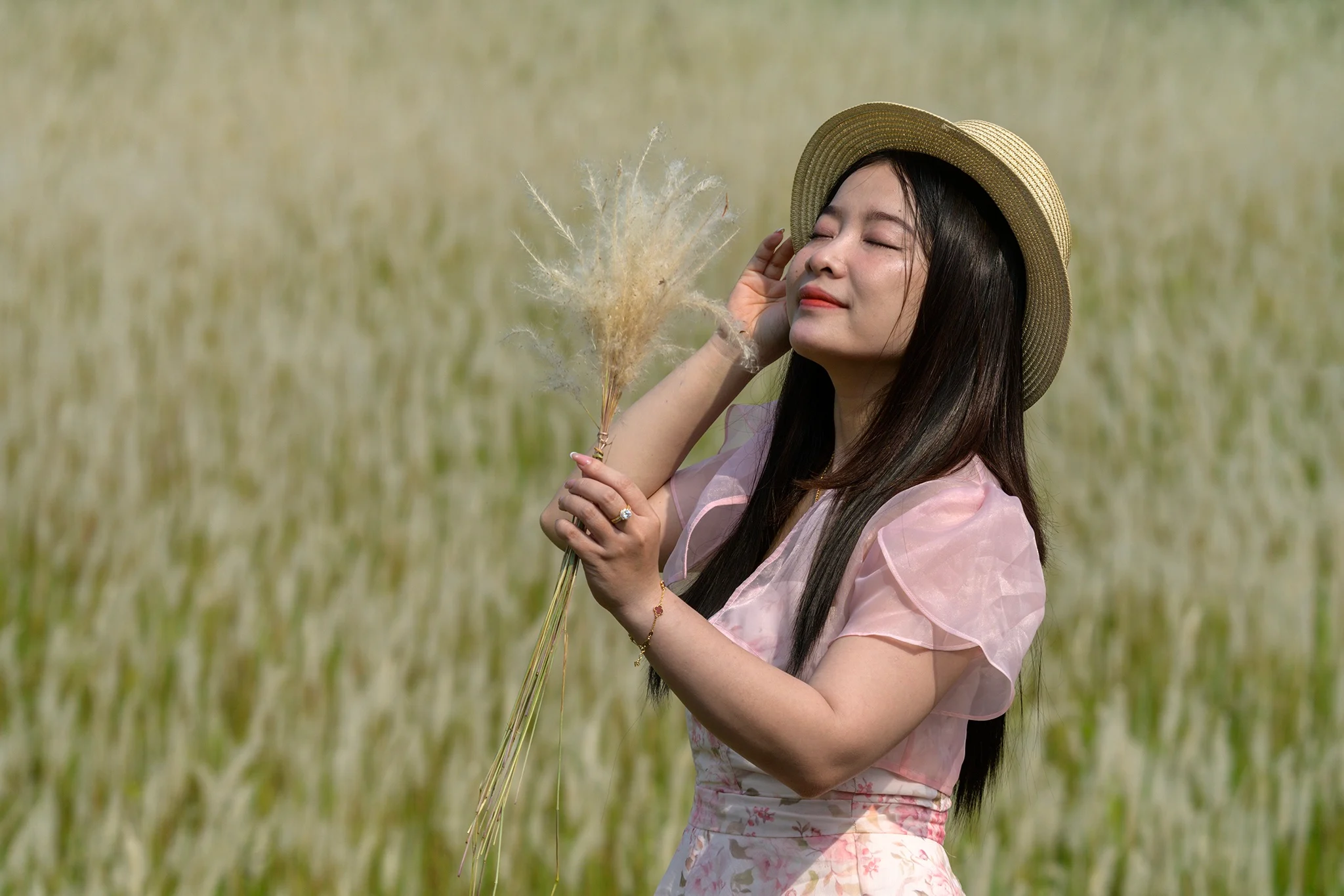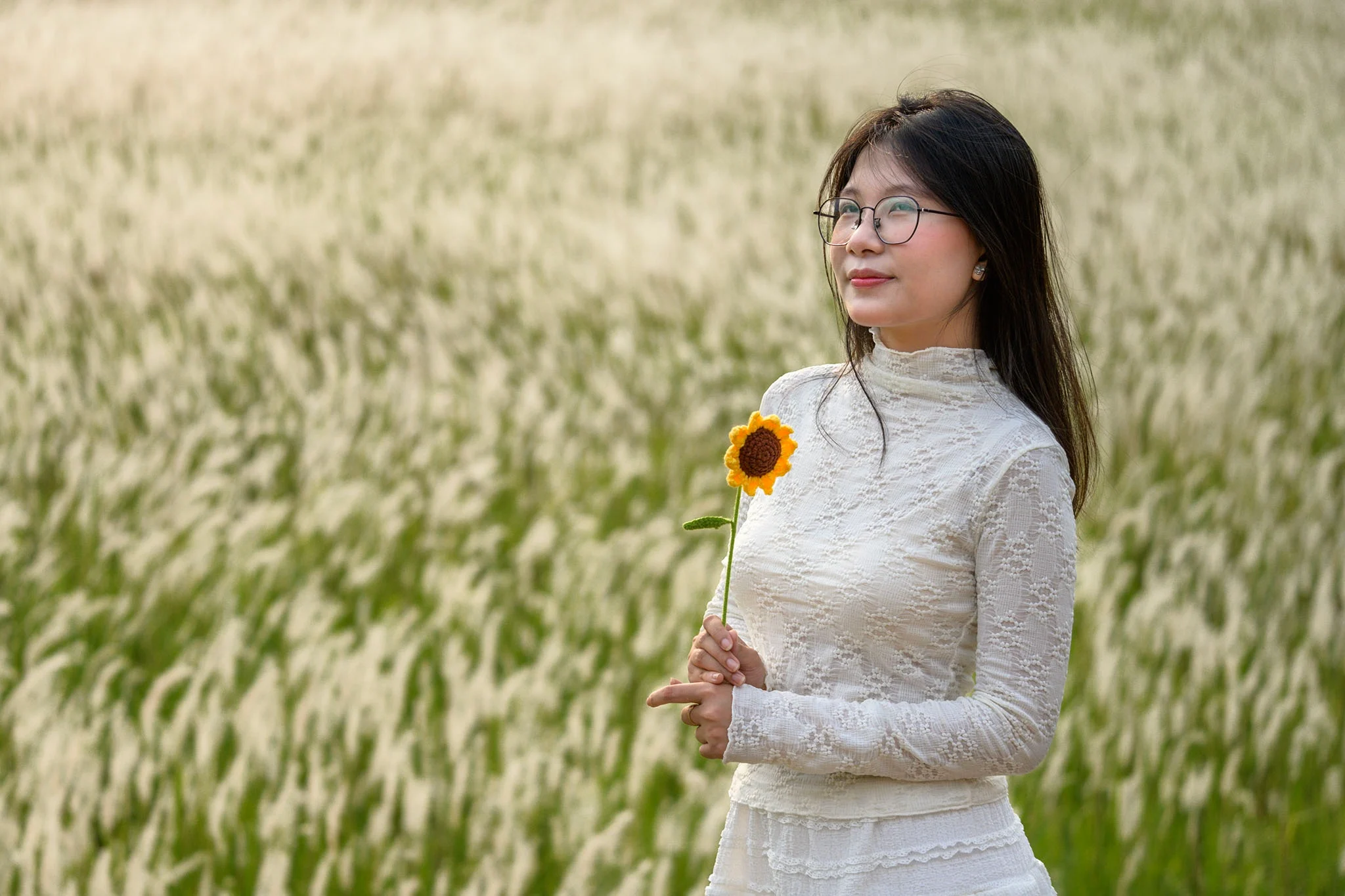 Một số bạn trẻ còn hái cỏ lau để làm phụ kiện khi chụp ảnh, tạo thêm điểm nhấn nhẹ nhàng và phù hợp với khung cảnh thơ mộng của cánh đồng.