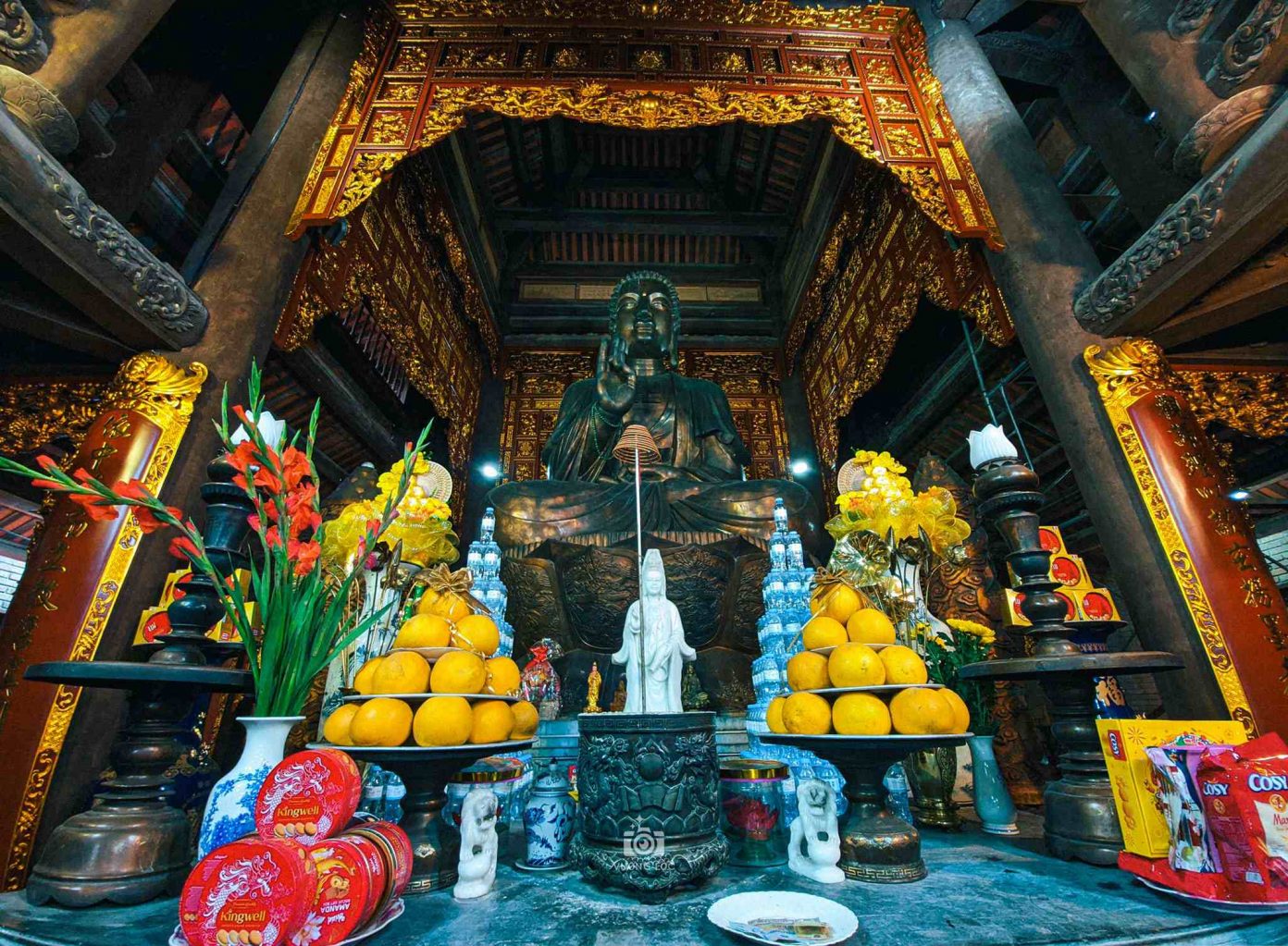 Giữa chính điện, tượng Phật Tổ Như Lai bằng đồng nguyên khối cao 6,5 m, nặng khoảng 30 tấn,