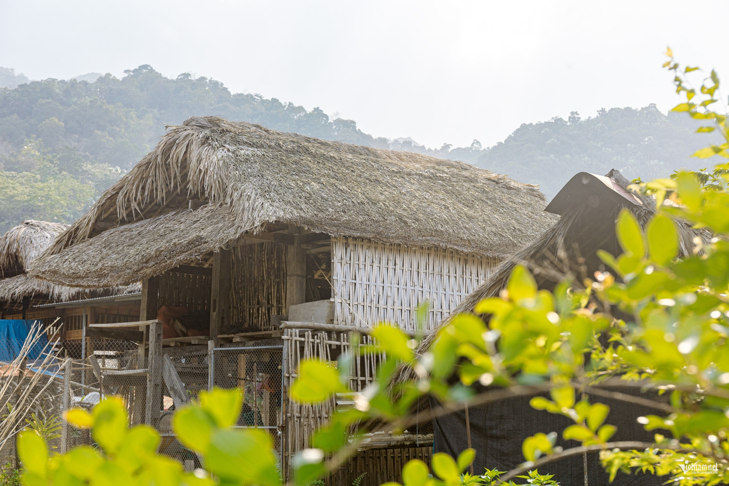 Mái lá cọ thấm đẫm dấu vết của mưa nắng và thời gian. Bộ khung gỗ lim vững chãi qua nhiều thế hệ nâng đỡ cả ngôi nhà