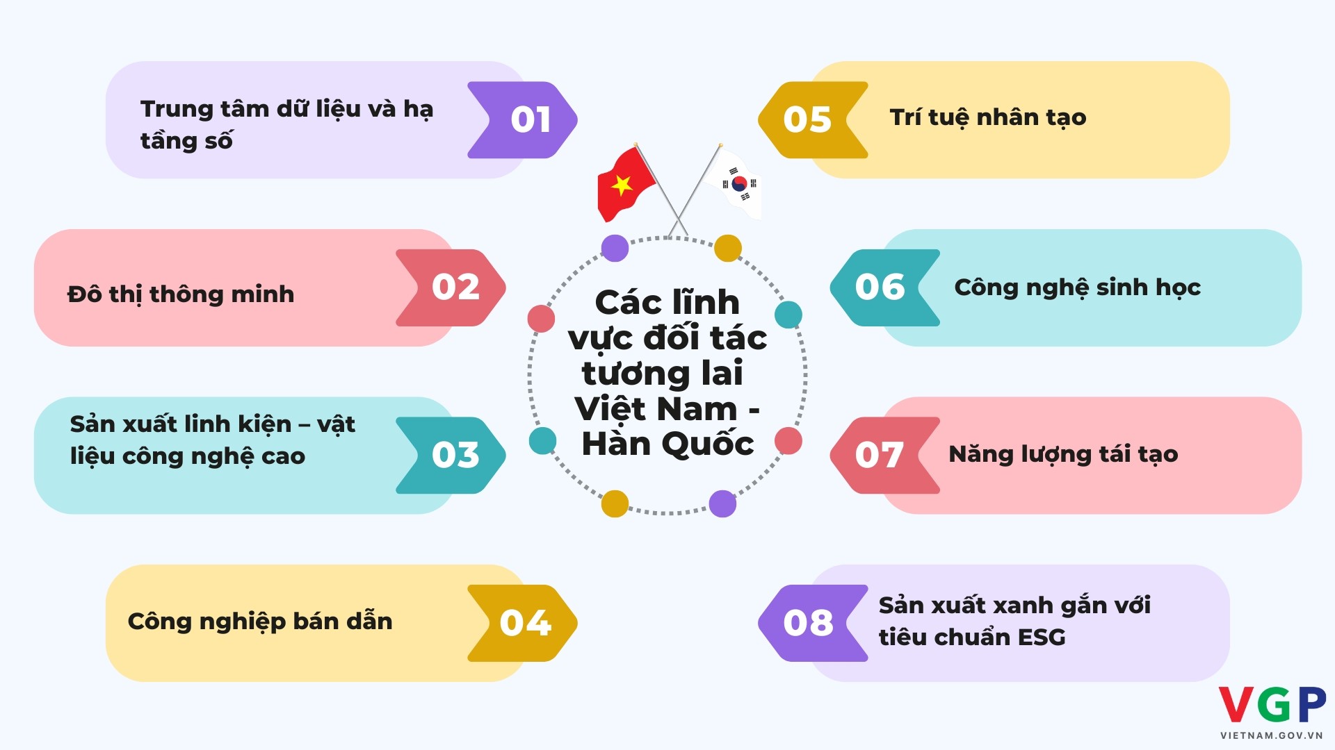 Không chỉ các "đại bàng" FDI quy mô toàn cầu như Samsung, SK, Hyundai, nhiều doanh nghiệp vừa và nhỏ của Hàn Quốc có năng lực công nghệ cao cũng đang mở rộng đầu tư vào các lĩnh vực then chốt như: Trung tâm dữ liệu và hạ tầng số, đô thị thông minh, sản xuất linh kiện – vật liệu công nghệ cao, công nghiệp bán dẫn, AI, công nghệ sinh học, năng lượng tái tạo, sản xuất thân thiện môi trường và phát triển bền vững gắn với tiêu chuẩn ESG (Môi trường, xã hội, quản trị).