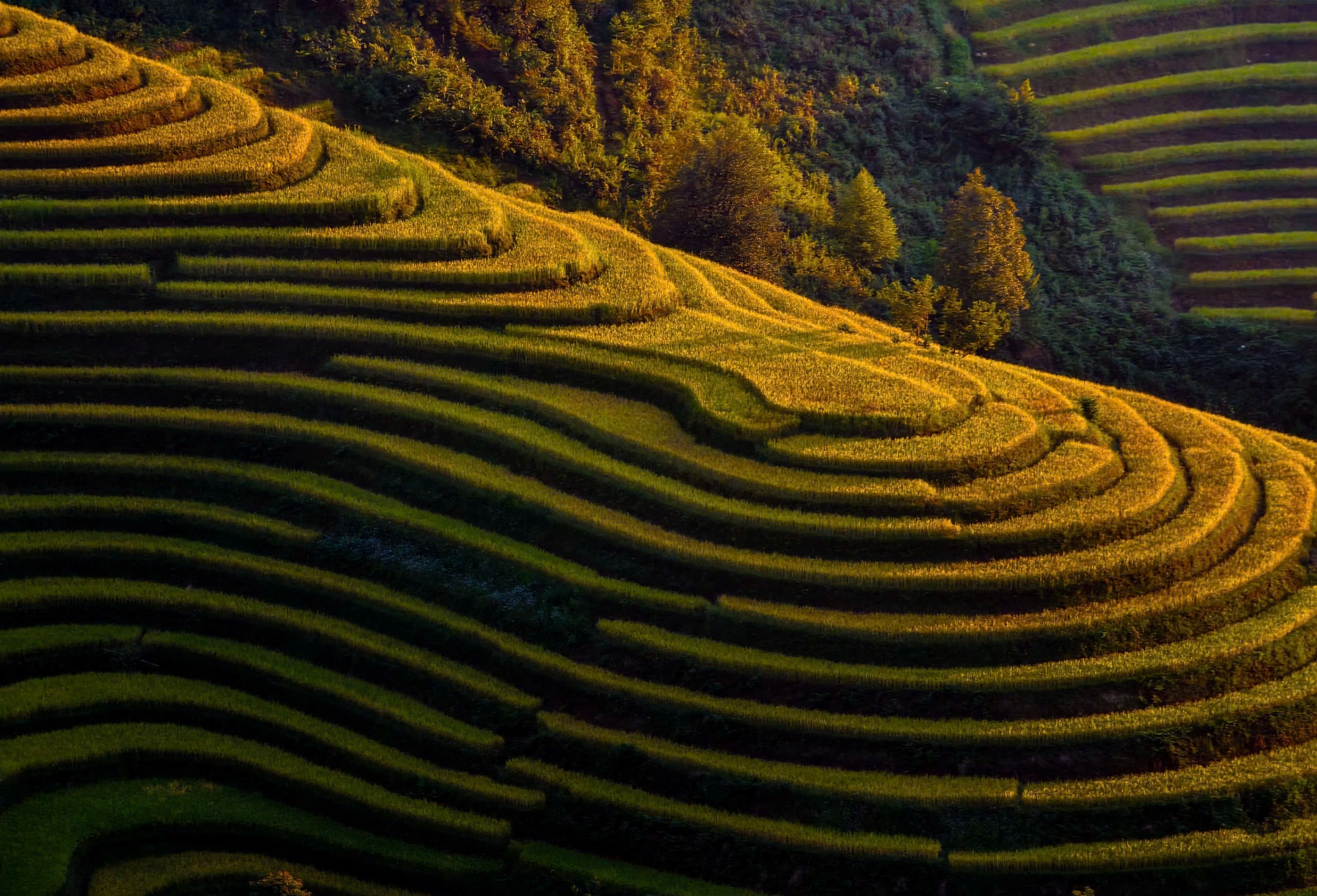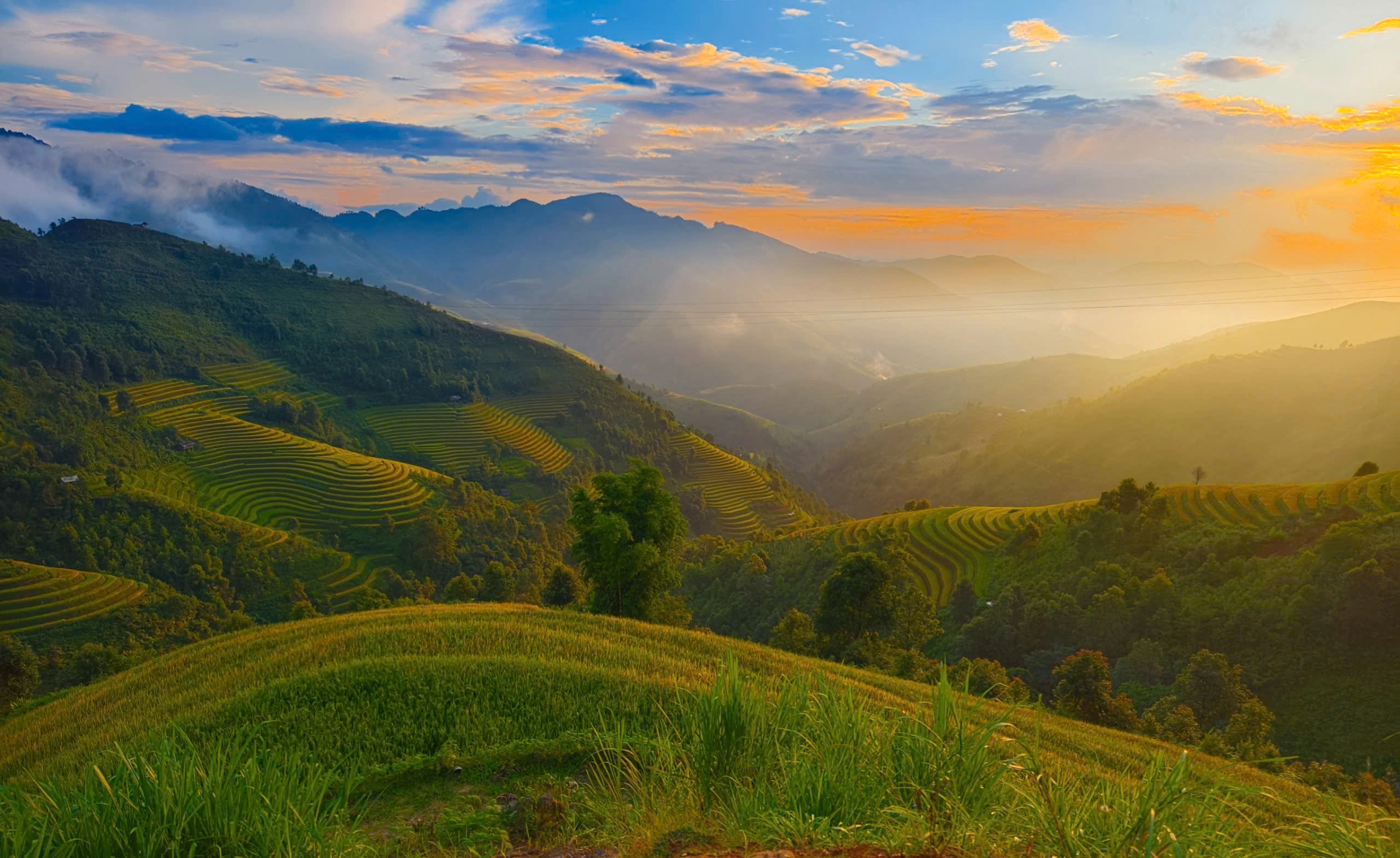 Bức ảnh ghi lại cảnh hoàng hôn tại võng lúa bản Chống Sống.