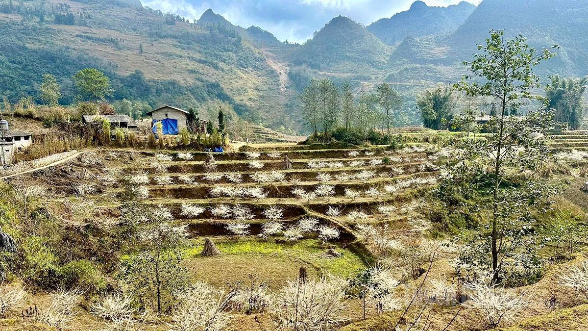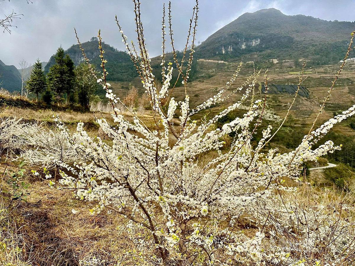 Những vườn mận trắng bung nở trên miền đá, làm cho không gian đất trời biên cương trở nên lãng mạn.
